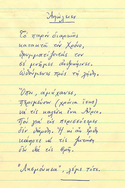 «Η μέρα έδειχνε πως θα περάσει / αχρωμάτιστη, όπως και τόσες προηγούμενές της. […] Ευτυχώς έτσι και πέρασε.»