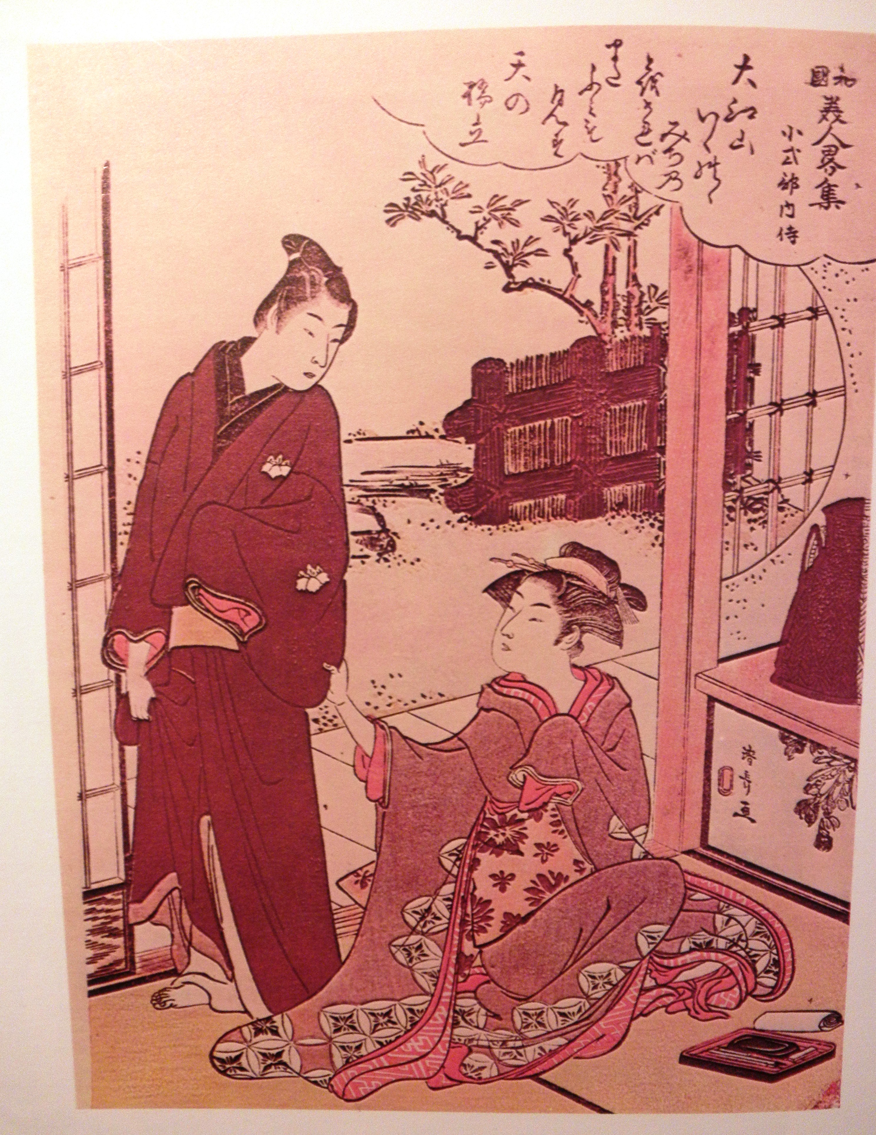 Τόριι Κιγιονάγκα: «Η κυρία της Αυλής Κοσικίμπου» [Απεικονίζεται η κυρία της Αυλής Κοσικίμπου να συγκρατεί έναν ευγενή από το μανίκι και να συνθέτει ένα ποίημα για να τον συγκινήσει]